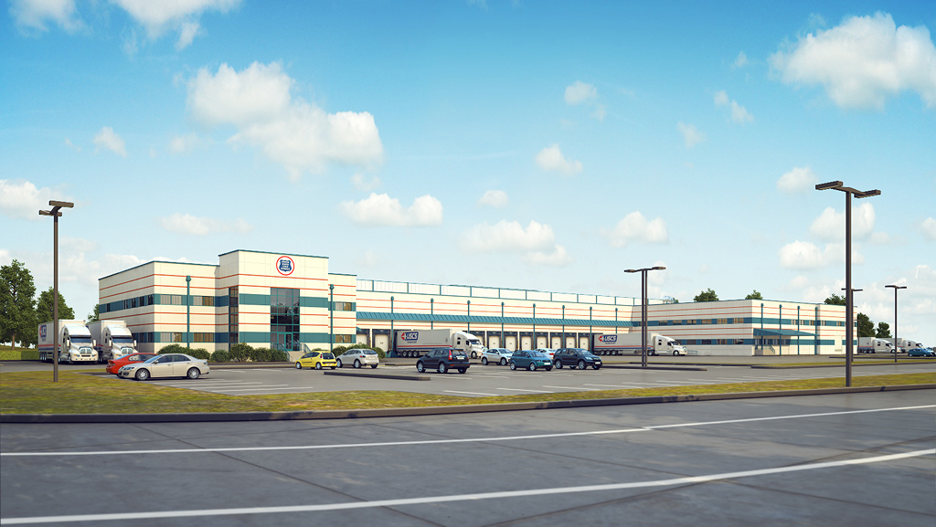Industrial Warehouse with Parking Under Clear Blue Sky